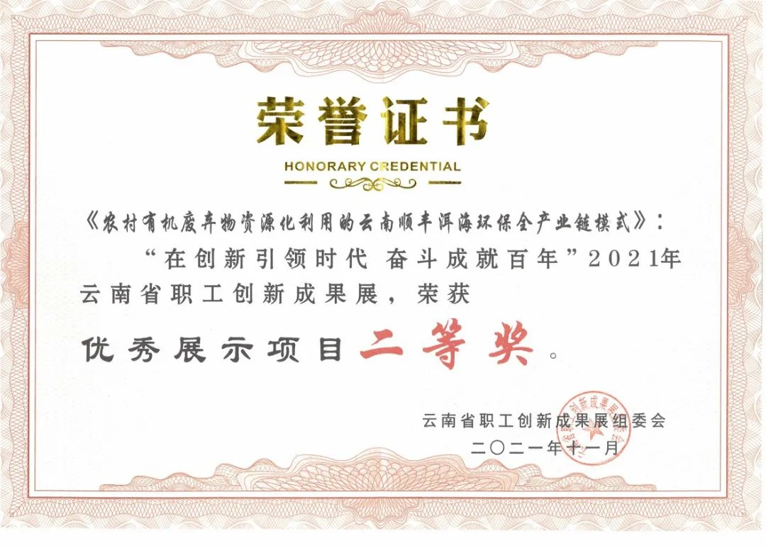 11月中旬,由云南省總工會在昆明舉辦的“創新引領時代·奮斗成就百年”職工創新成果展活動中,大理州企業家協會常務副會長單位——云南順豐洱海環保科技股份有限公司參展的“農村有機廢棄物資源化利用全產業鏈模式”榮獲“優秀展示項目”二等獎。