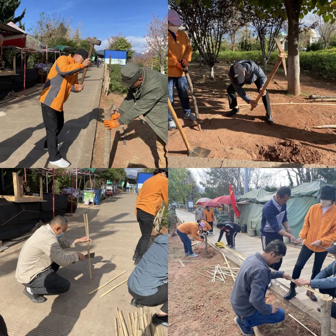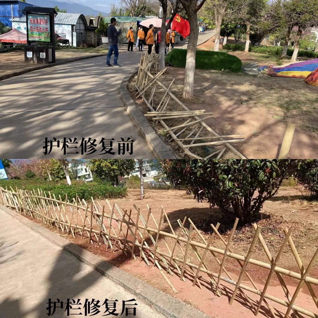 活動現(xiàn)場,黨旗高高飄揚,全體黨員熱情高漲,分工明確。你劈竹子、我打木樁、他編網(wǎng),各項工作有條不紊的進行著,人人都參與、個個動手,整個過程熱火朝天。最終,經(jīng)過大家的辛勤勞動,把竹護欄修護如初,有效解決了長期困擾公園綠化帶邊緣草坪踩踏問題,達到了提升景區(qū)環(huán)境質(zhì)量的目的。